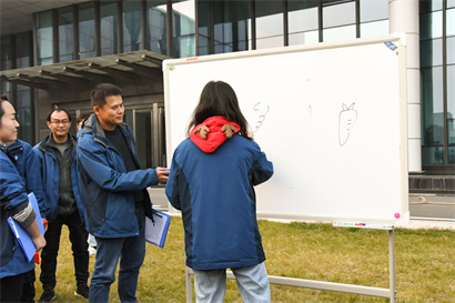 “珠行萬里”“急速60秒”“畫畫猜歌名”“拔河比賽”。每個(gè)項(xiàng)目都成功吸引到忠實(shí)擁護(hù)的鐵粉,盡管有沒厘清楚規(guī)則就手忙腳亂的開始拿著u型道具亂奔的朋友,還有益智猜卡片規(guī)則卡殼到懷疑自己智商的朋友,也有瞪著圓溜溜的大眼要在白板上畫野狼disco卻不知道怎么下筆的朋友。諸多坎坷也不影響到員工們的興致盎然,逗得觀賽的同事們又急又好笑。